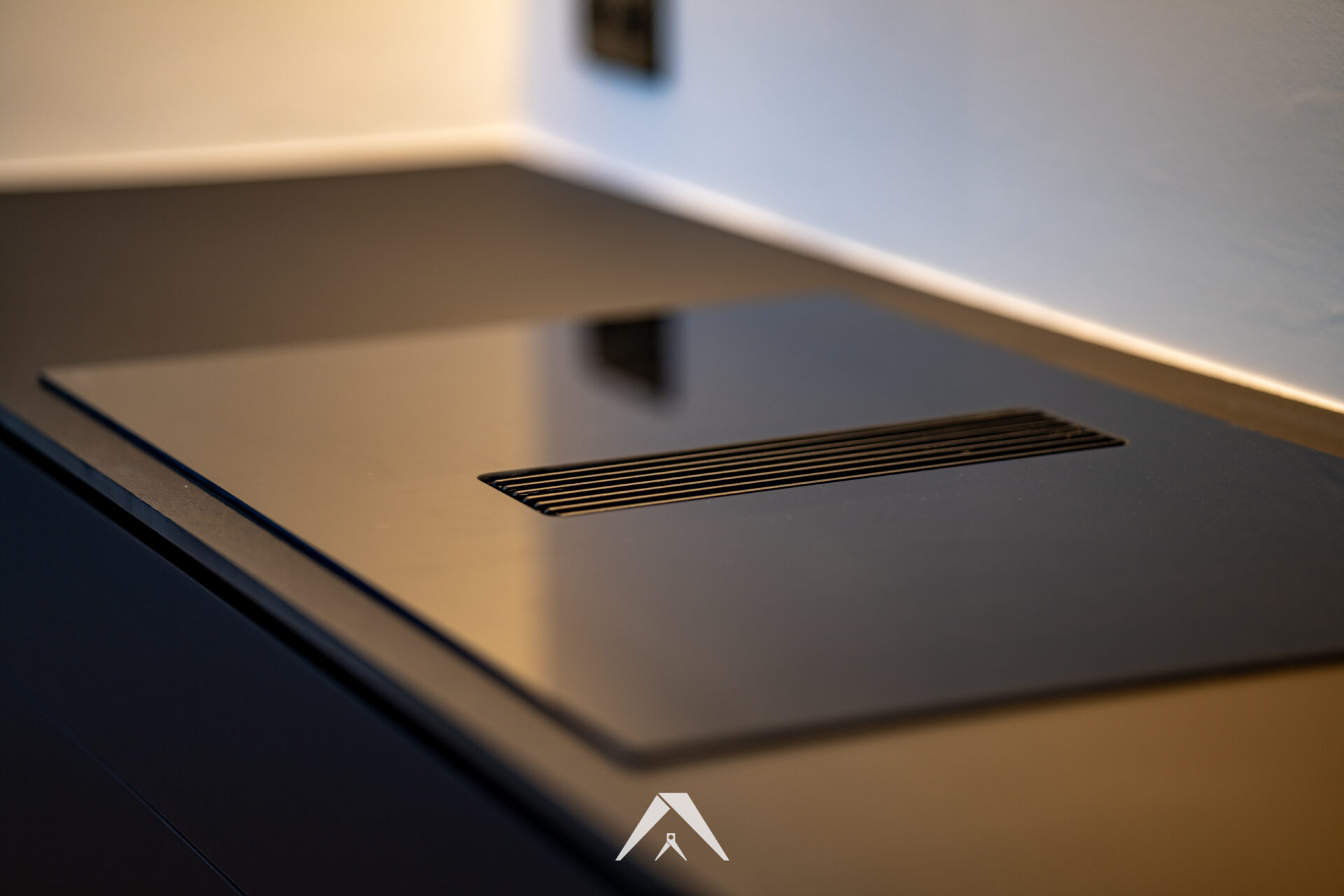 De plafondhoge ramen in zowel de keuken als de leefruimte creëren een naadloze overgang naar het ruime buitenterras van 30 m².